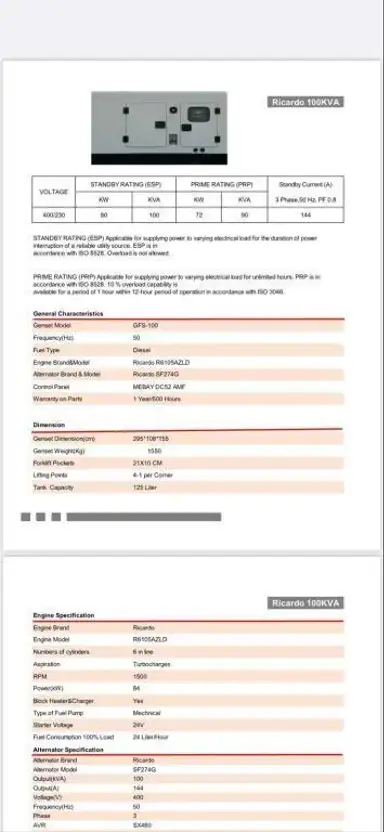 Ricardo 100 KVA (80KW) Silent Generator 3 Phase 50HZ 400V ATS New Unused many units in stock